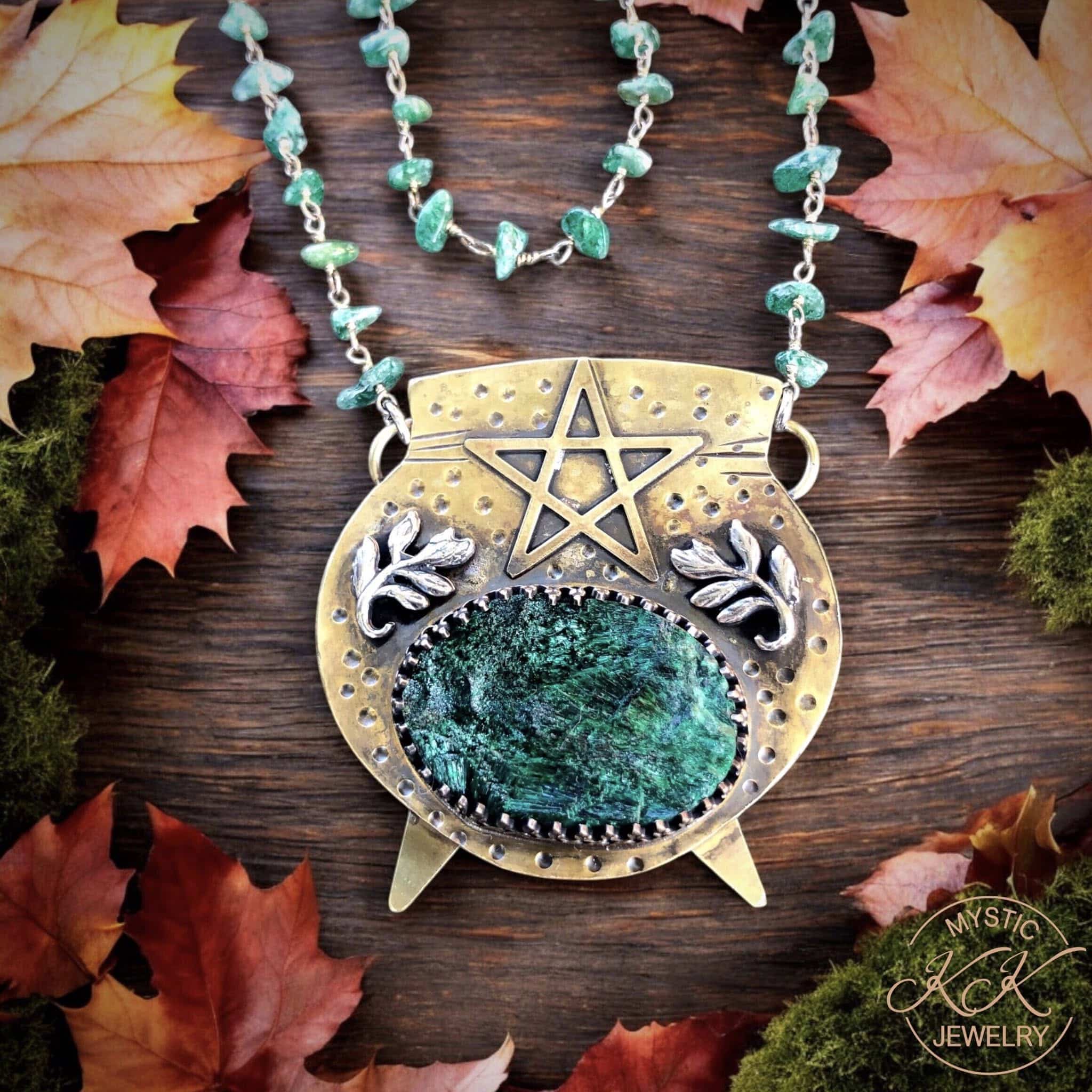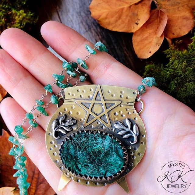 Materials used: rare Fibrous Malachite det in hand textured and oxidized brass, sterling silver leaf castings, brass pentacle, and 30″ silver plated chain with Mica stones