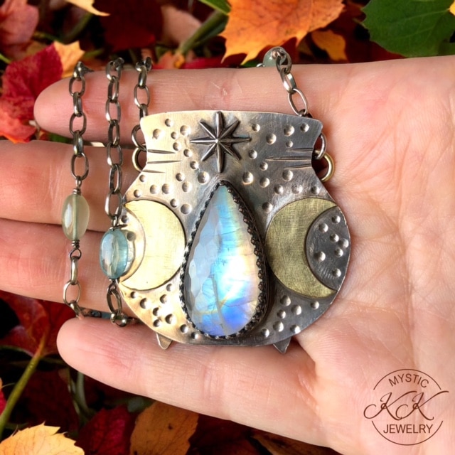 Materials used: rainbow moonstone set in hand-textured and oxidized sterling silver, brass moons & sterling silver star, and 18″ sterling silver chain with aquamarines and toggle clasp