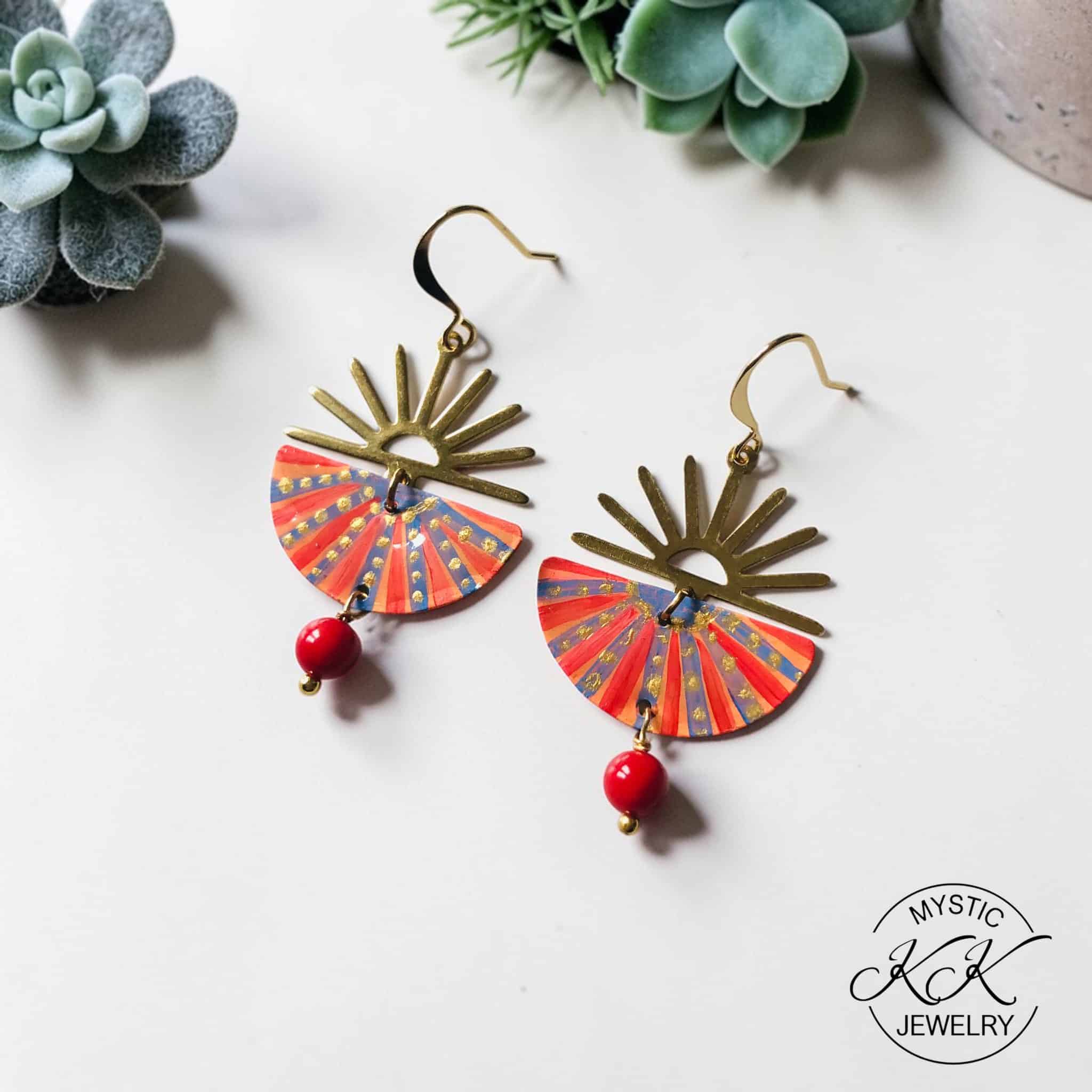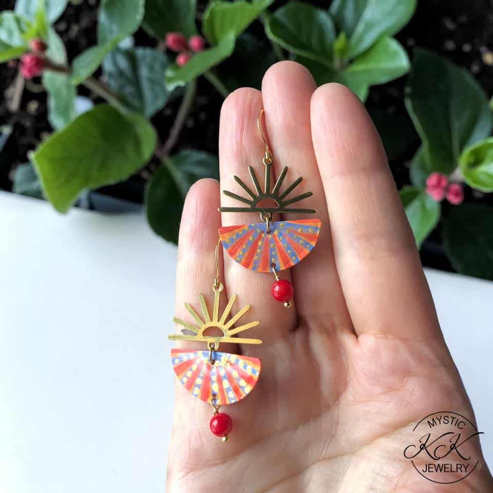 Materials used: Red coral, brass that I hand painted and coated with UV resin, brass sun symbol and gold plated Hooks.