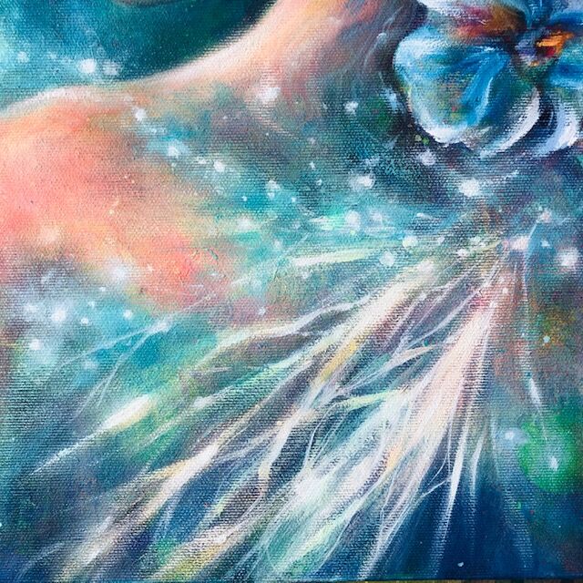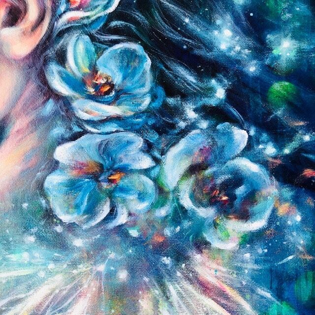 Often I begin a piece without a specific idea in mind and just let it evolve as I go with the flow. Many times I paint from my dreams and soul memories that emerge as I create, letting my heart and soul lead the way.