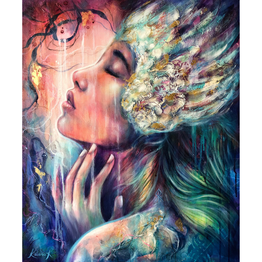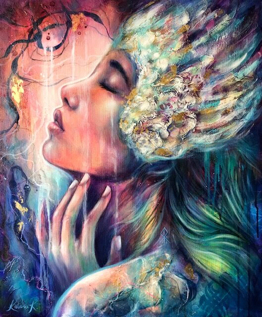 Often I begin a piece without a specific idea in mind and just let it evolve as I go with the flow. Many times I paint from my dreams and soul memories that emerge as I create, letting my heart and soul lead the way.
