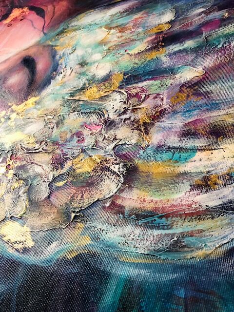 Materials used: Oils, 24k gold leaf, texture & mixed media – on gallery wrapped canvas
