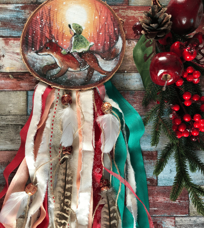 - Ribbon, lace, white cotton or patterned material, string, large wooden beads, feathers, etc.