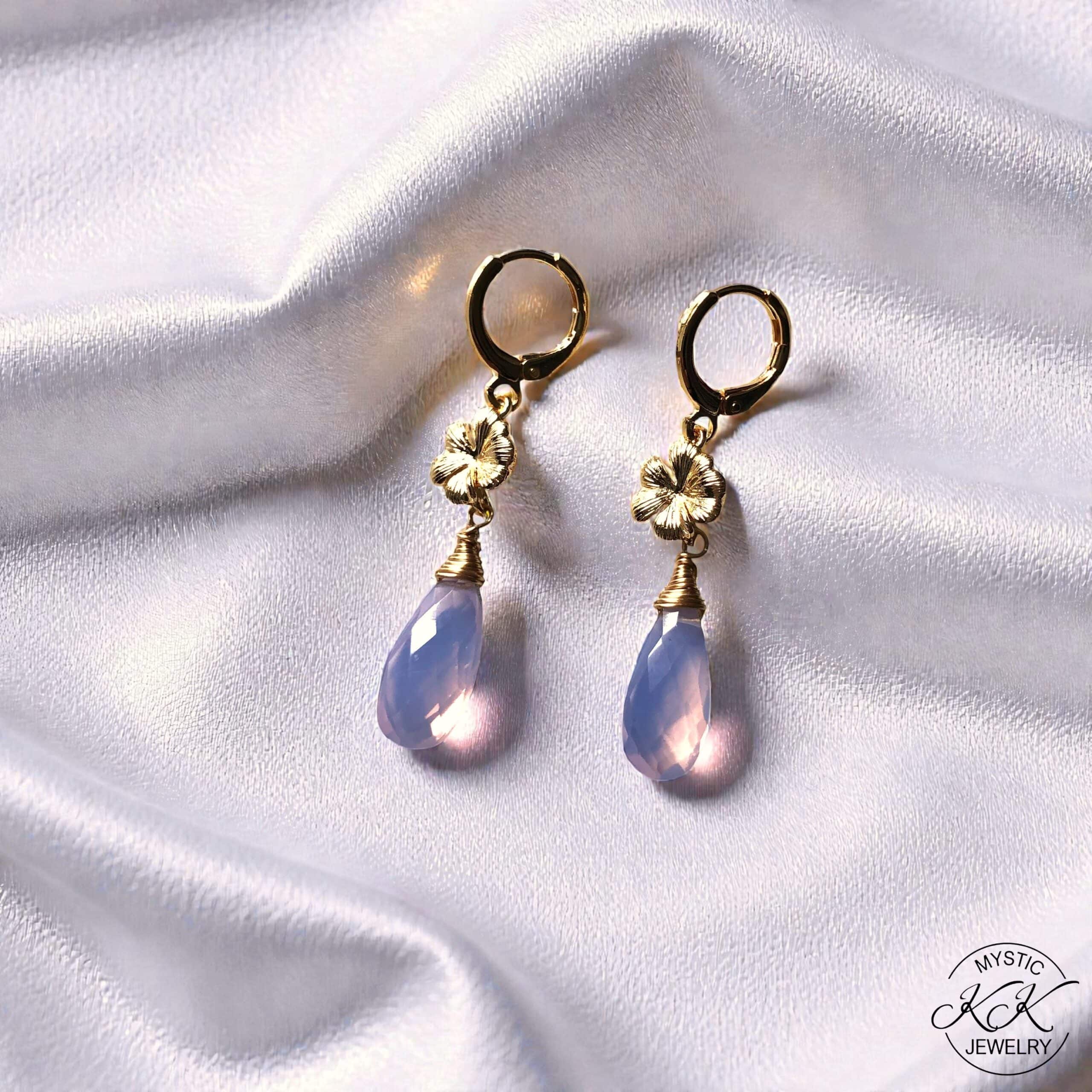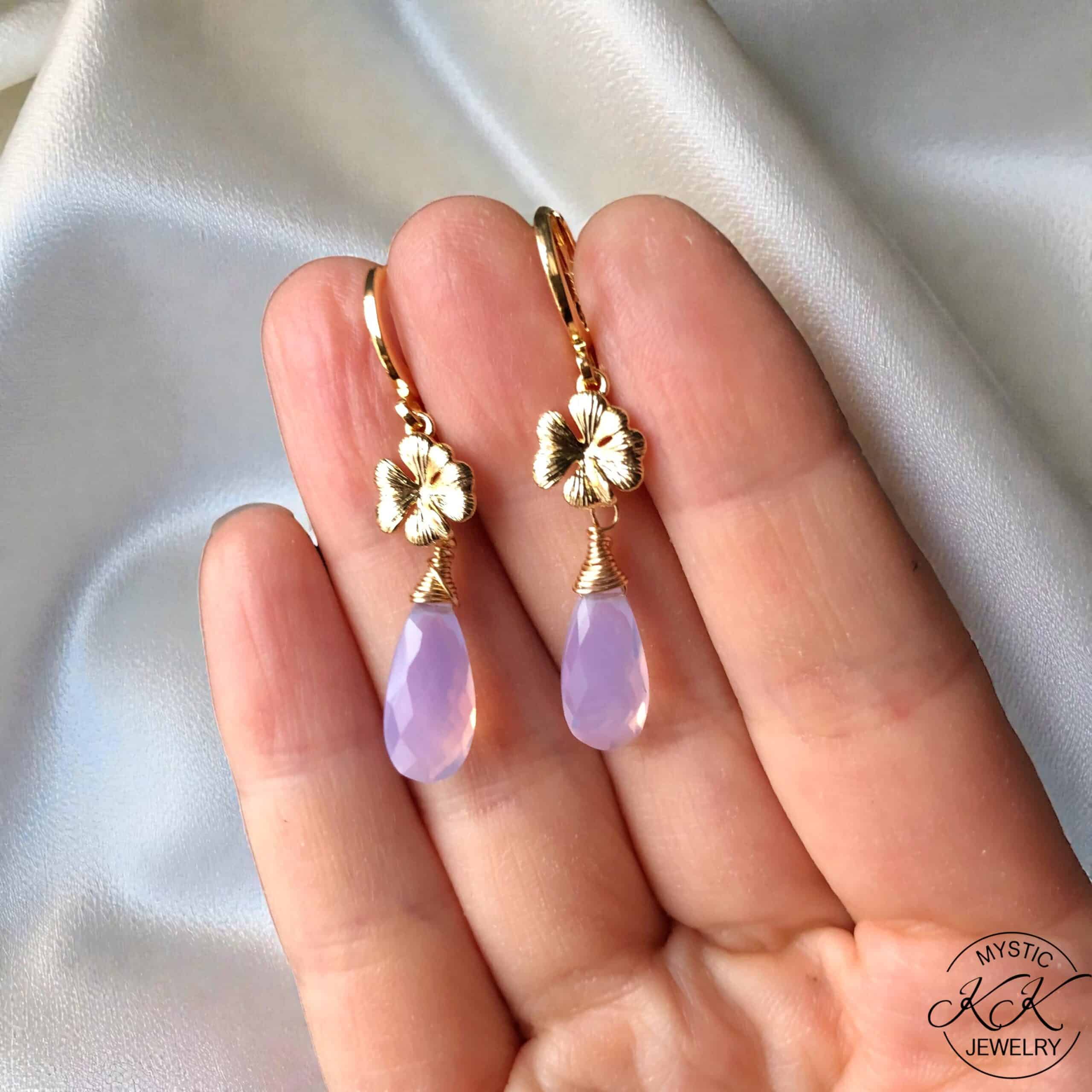 These earrings glow with the soft, dreamy light of lavender quartz—each faceted drop catching the light in the prettiest, most gentle way. Little gold flowers sit above the stones, giving them that just-picked-from-a-secret-garden feeling… like something quietly magical you stumble upon while wandering through nature.